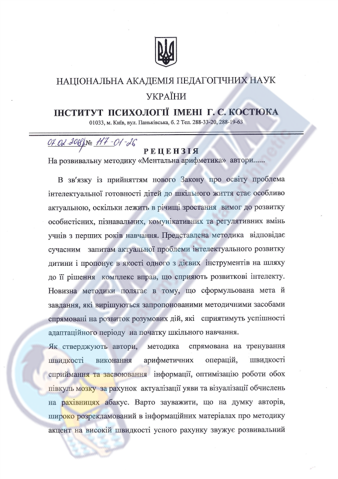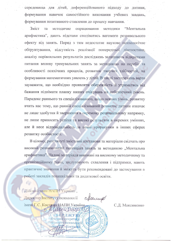 В свою очередь ученые Института психологии им. Г.С. Костюка Национальной академии педагогических наук Украины отметили высокий развивающий потенциал занятий по методике «Ментальная арифметика» «Академии развития интеллекта SMARTUM Украина». Эксперты сообщили, что материалы курса выполнены с высокой степенью профессионализма и рекомендуют использовать методику «Ментальная арифметика» в работе внешкольного и дополнительного образования.